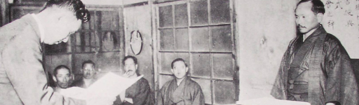 Gichin Funakoshi sensei i midten med sai
